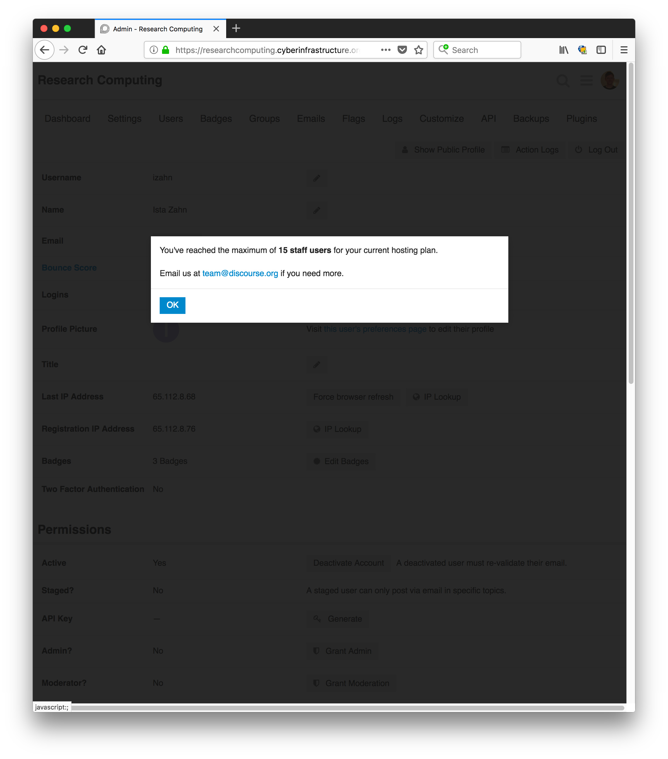 I just hit a snag with this. @izahn and I had lunch with Austin from Harvard FAS Research Computing yesterday and whom I encouraged to join this site. I just tried to make @izahn an admin but I got this error (and I get the same error when trying to make him a moderator):